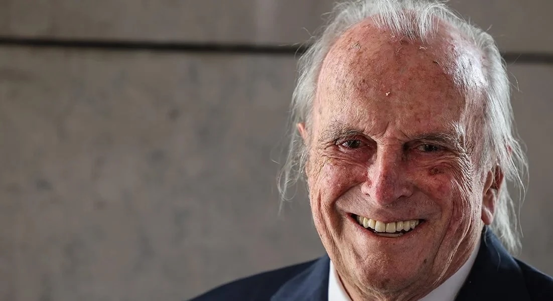 Francisco Pinto Balsemão, idoso, de fato e gravata, sentado num ambiente formal, com expressão séria e a gesticular com uma mão, durante um evento público.